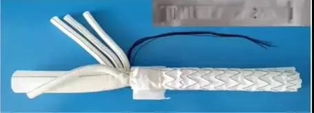 一體化免縫合帶支架人工血管系統(tǒng)包括人工血管和免縫合扣帶兩部分,通過主動脈覆膜支架進行腔內(nèi)修復,一般由股動脈導入,到達病變部位后釋放支架,支架撐開后固定在主動脈內(nèi)壁,將病變血管覆蓋,重建安全通路,恢復血流循環(huán)。