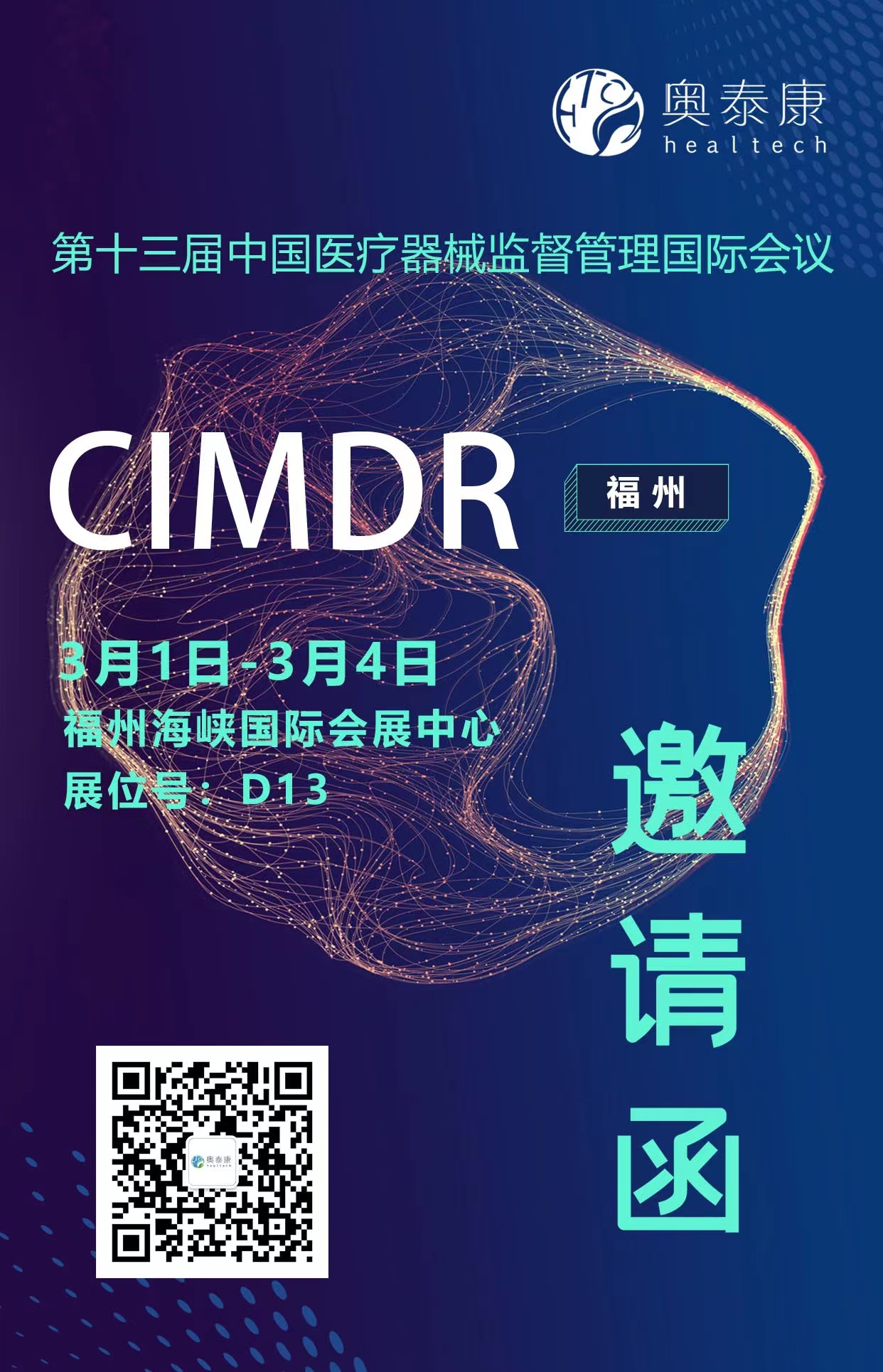 2023年3月1日-4日,第十三屆中國醫(yī)療器械監(jiān)督管理國際會議(CIMDR)將于福建省福州市海峽國際會展中心隆重舉行,奧泰康作為參展商和演講嘉賓參加會議,誠摯邀請各位醫(yī)療同仁蒞臨展位。
