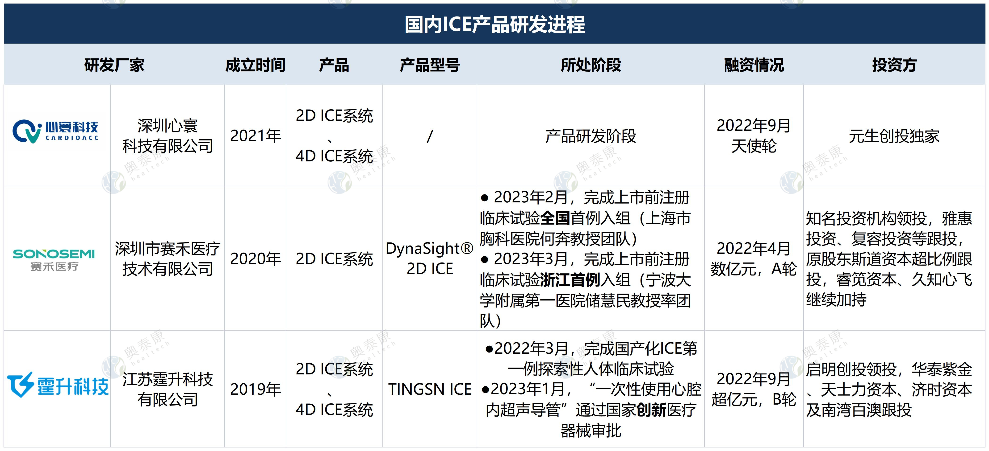 全球ICE市場中,歐美企業(yè)占主要份額,強生、雅培、西門子、飛利浦、GE醫(yī)療、波士頓科學等均已布局,而國內ICE起步較晚,仍處發(fā)展初期,相關產品和市場滲透率較低,企業(yè)具有較大的發(fā)展空間,國內研發(fā)廠商有塞禾醫(yī)療、心寰科技、霆升科技、澤樸醫(yī)療、歡影醫(yī)療等。隨著ICE在臨床應用優(yōu)勢的凸顯,ICE賽道逐漸升溫并獲得資本青睞,國內部分ICE廠家已在2022年完成新一輪融資。