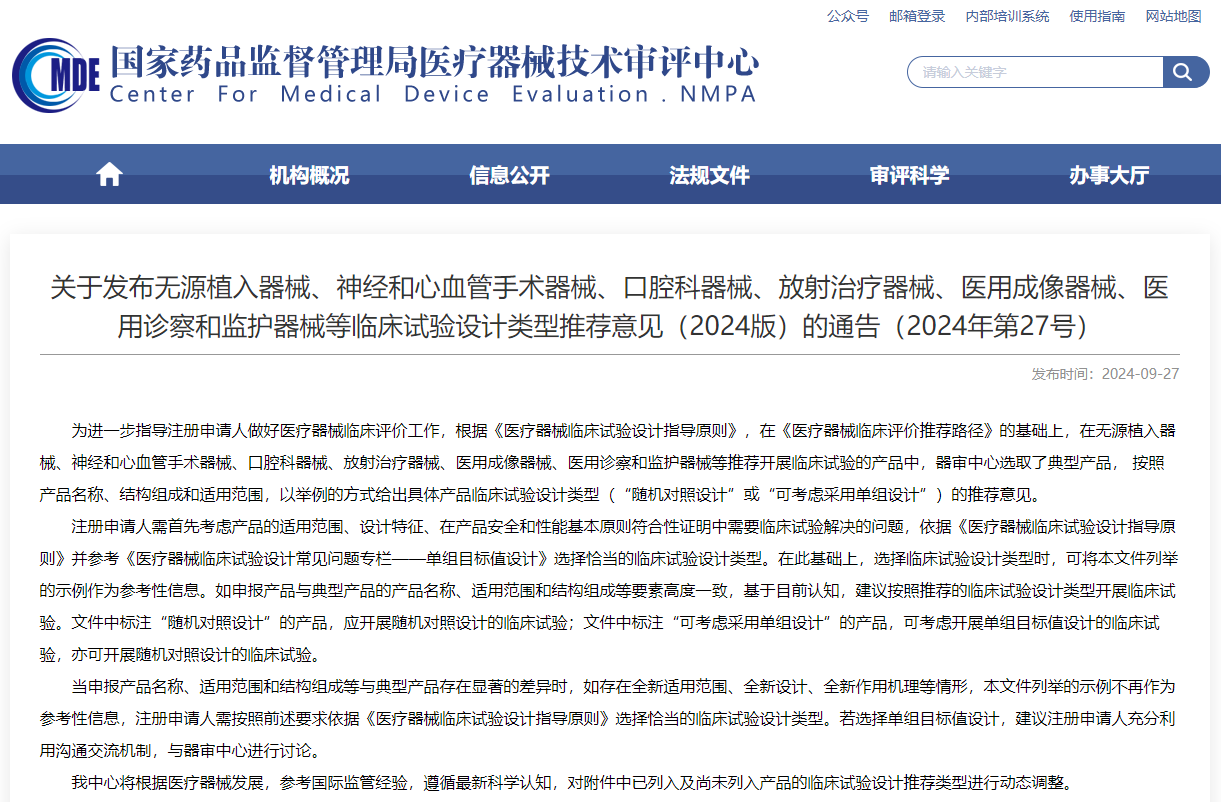無源植入器械、神經(jīng)和心血管手術(shù)器械、口腔科器械、放射治療器械、醫(yī)用成像器械、醫(yī)用診察和監(jiān)護(hù)器械等臨床試驗設(shè)計類型推薦意見近日,器審中心發(fā)布《無源植入器械、神經(jīng)和心血管手術(shù)器械、口腔科器械、放射治療器械、醫(yī)用成像器械、醫(yī)用診察和監(jiān)護(hù)器械等臨床試驗設(shè)計類型推薦意見(2024版)的通告》。