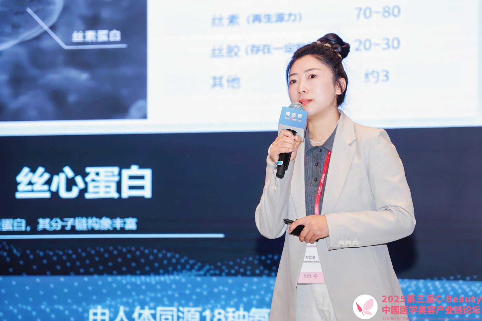鄭立波女士圍繞絲素蛋白的天然優(yōu)勢、技術(shù)突破與美妝市場前景進行了深度分享。