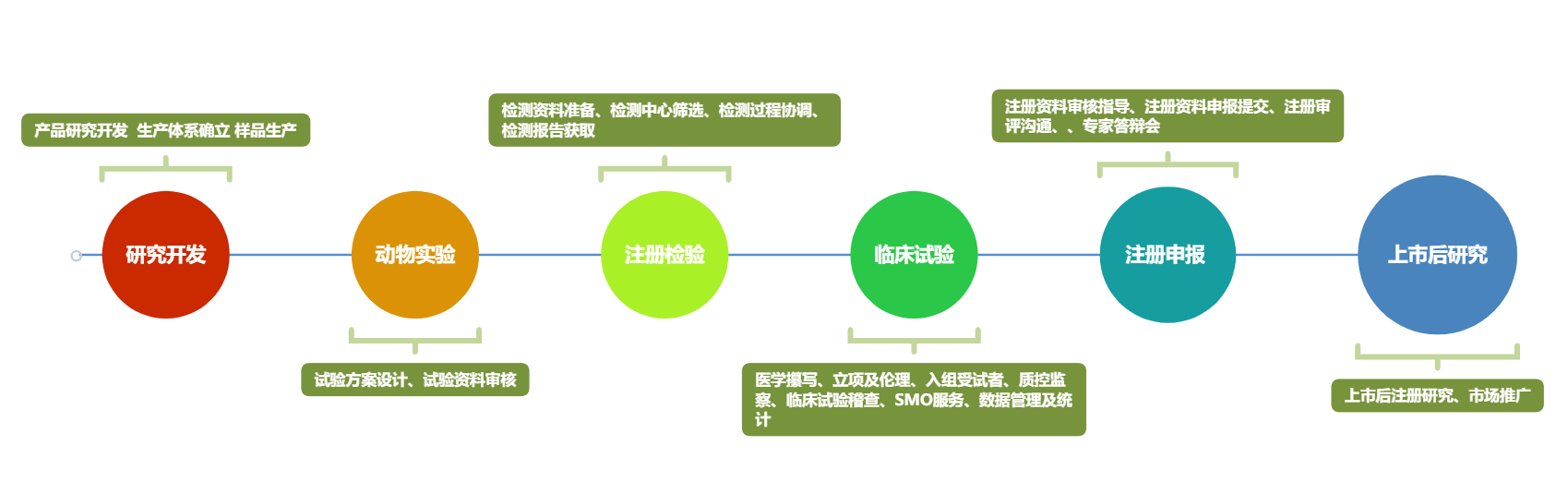 研究開(kāi)發(fā)—?jiǎng)游飳?shí)驗(yàn)—注冊(cè)檢驗(yàn)—臨床試驗(yàn)—注冊(cè)申報(bào)—上市后研究